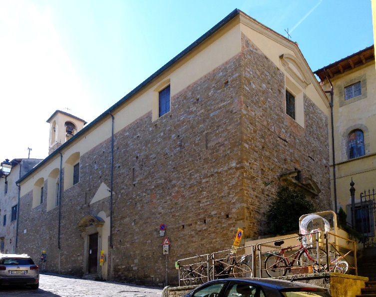 History Originally a Romanesque church founded around 1050, mentioned in a papal bull by Lucius III of March 3rd 1184, the church was largely rebuilt in the late 14th century when it became a parish church to cope with the increased population in the area, funding coming from Bernardo Quaratesi who commissioned from Gentile da Fabriano the Quaratesi Polyptych of 1425, now dismembered and dispersed to various museums (see below). Renovation followed the flood of 1557 and Vasari radically modernised the interior in 1567, installing monumental altars with altarpieces by Il Poppi, Allori and Curradi. Restoration work after the 1966 flood brought to light some fragments of the 15th-century decoration beneath Vasari's additions, such as the Saint Ansanus attributed to Francesco d'Antonio to be found in the chapel at the end of the right-hand side, along with its sinopia opposite. Interior A single nave, tall and plain with a timber roof. Three grey stone and gilded altars down each side of the nave and two flanking the door on the rear facade. Two deep chapels just before the east end, making a crossing of sorts. No labels for any of the art. A fresco showing Saint Ansanus was uncovered here in 1925 and detached (uncovering its sinopia) in 1965. It was initially attributed to Gentile da Fabriano, but later opinion gives it to Francesco di Antonio. It is now in a chapel to the right of the nave. (See photo below right) with its sinopia displayed opposite. It was found behind an altarpiece of God the Father and Saints of Jacopo da Empoli, still on the wall of the nave opposite this chapel. This altarpiece has an ornate oval hole in it through which the face of the saint was visible, it having been mistaken for a face of the Virgin, The left hand chapel has loose tomb slabs propped against its walls. Another detached fresco fragment is on the inner façade, to the left. It depicts Sant'Antonio Abate (see below right) and is now thought to be by the Master of Signa, an anonymous pupil of Bicci di Lorenzo. There is no high altarpiece, but there is an organ loft above. Over the altar in the chapel to the left of the presbytery is a painting of The Preaching of the Baptist (1608) by Jacopo da Empoli, and over the one to the right is The Marriage of the Virgin (1579) by Il Poppi, in a niche meant for a larger painting with an unusually young-looking Joseph. The Michelozzo crucifix is now to be found in a niche over the middle altar on the right side, between two painted cut outs of Mary and John. Jesus has had a cloth tied around his waist, literally. The church has two paintings by Allori, The Martyrdom of Saint Catherine of 1582 over the middle altar on the left, and The Sacrifice of Isaac, signed and dated 1583, on the inner façade on the left. There's also a 12th-century crypt here, the only part of the original church that remains. But photos findable on Wikipedia show it worryingly being used as a restaurant The Sacristy In the sacristy is the reportedly highlight fresco of The Madonna of the Girdle of 1450, probably by Alessio Baldovinetti, in an arched stone shrine attributed to Michelozzo. In here are also said to be found panels by Bicci di Lorenzo and his son Neri di Bicci. I've also read about work here by the Master of Signa, an anonymous pupil of Bicci di Lorenzo, but this may be the fine detached fresco of Sant'Antonio Abate on the inner façade. ![]() Also five panels from a dossal of 1425 by Gentile da Fabriano, called The Intercession Altarpiece (see above) almost certainly commissioned to commemorate the death of Bernardo di Castello Quaratesi. Its central panel depicts Christ and the Virgin’s
