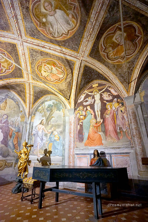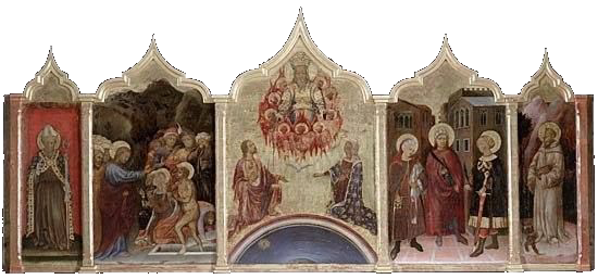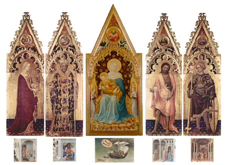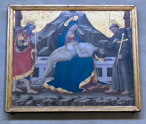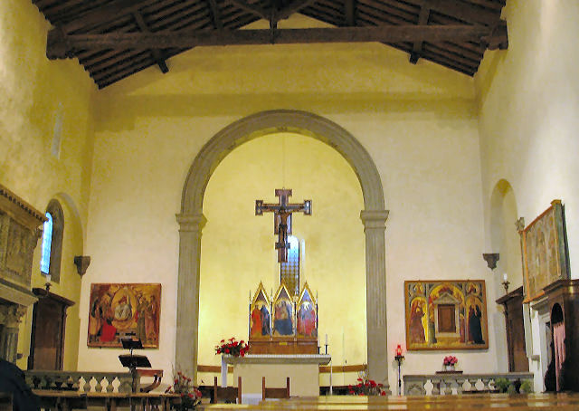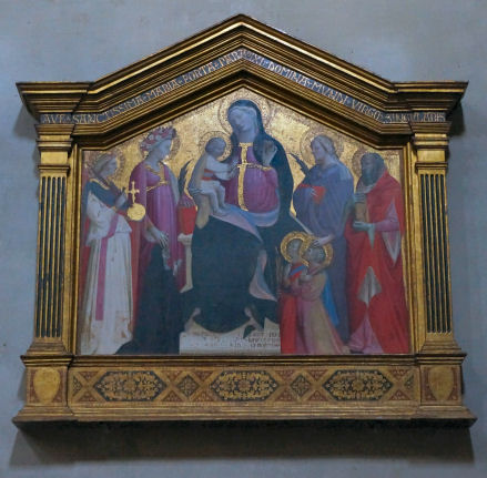 History Originally a Romanesque church founded around 1050, mentioned in a papal bull by Lucius III of March 3rd 1184, the church was largely rebuilt in the late 14th century when it became a parish church to cope with the increased population in the area, funding coming from Bernardo Quaratesi who commissioned from Gentile da Fabriano the Quaratesi Polyptych of 1425, now dismembered and dispersed to various museums (see below). Renovation followed the flood of 1557 and Vasari radically modernised the interior in 1567, installing monumental altars with altarpieces by Il Poppi, Allori and Curradi. Restoration work after the 1966 flood brought to light some fragments of the 15th-century decoration beneath Vasari's additions, such as the Saint Ansanus attributed to Francesco d'Antonio to be found in the chapel at the end of the right-hand side, along with its sinopia opposite. Interior In the sacristy is the reportedly highlight fresco of The Madonna of the Girdle of 1450, probably by Alessio Baldovinetti, or maybe Michelozzo. In here are also said to be found panels by Bicci di Lorenzo and his son Neri di Bicci. I've also read about work here by the Master of Signa, an anonymous pupil of Bicci di Lorenzo, but this may be the fine detached fresco of Sant'Antonio Abate on the inner façade. ![]() Also five panels from a dossal of 1425 by Gentile da Fabriano, called The Intercession Altarpiece (see above) almost certainly commissioned to commemorate the death of Bernardo di Castello Quaratesi. Its central panel depicts Christ and the Virgin’s Intercession to God the Father, the side panels show Saint Louis of Toulouse, The Raising of Lazarus, Saints Comas and Damian with Saint Julian, and Saint Bernard. The panels were damaged in the fire here in 1897 and the flood of 1966. They also suffered neglect and bad restoration and were left in the storerooms of the Pitti Palace. Restoration began in 1995 and lasted 11 years, with the altarpiece then put on display at the Medici Palace. It is now back here, it is said. It may have originally come from San Salvatore al Monte. A fresco showing Saint Ansanus uncovered here in 1925, and detached (uncovering its sinopia) in 1965, was initially attributed to Gentile da Fabriano too, but later opinion gives it to Francesco di Antonio. ![]() There is no high altarpiece. Over the altar to the left is a middling painting of The Preaching of the Baptist (1608) by Jacopo da Empoli, and over the one to the right is The Marriage of the Virgin (1579) by Il Poppi, somewhat slapdashly hung in a niche meant for a larger painting. Il Poppi was a student of Vasari but this work looks more inspired by Andre del Sarto. The Michelozzo crucifix is now to be found in a niche over an altar on the right side, towards the door. It has had a towel draped around its waist. The church has two by Allori: The Martyrdom of Saint Catherine of 1582 and The Sacrifice of Isaac, signed and dated 1583, are either side of the door on the inner façade. Michelangelo hid in a small room at the base the bell-tower from the victorious Medici faction after the siege of Florence in 1530. He had sided with the republican faction. There's also a 12th-century crypt here, the only part of the original church that remains. But photos findable on Wikipedia show it worryingly being used as a restaurant Lost art An Annunciation panel by Masolino of c.1423/24 was the altarpiece of the Guardini chapel on the left side of the tramezzo here. When the tramezzo was demolished during Vasari's modernising it was moved to the altar of the other Guardini family chapel here. It was then moved in 1576 to the sacristy and replaced by a new Annunciation altarpiece by Alessandro Fei. The Masolino panel is now in the Washington National Gallery, in Room 4 next to the predella panel from the Quartesi Altarpiece by Gentile da Fabriano mentioned below. The Quaratesi Altarpiece (signed and dated 1425) (see reconstruction photo below right) was painted for the high altar here by Gentile da Fabriano. The four lateral panels depicting four saints (Mary Magdalen, Nicholas of Bari, John the Baptist and George with an Annunciation and Saints Francis and Dominic in the roundels) are in the Uffizi. These panels had remained here until 1879 when they were given to the Uffizi by the Marquis Niccolò Quaratesi, a descendent of the original patron. The rest of the altarpiece had been removed by around 1834. The central panel, The Virgin and Child with Angels with The Blessing Christ in the roundel, is in the London National Gallery, on long-term loan from the Royal Collection, having been bought by Prince Albert in 1846 from the nephew of William Young Ottley, the latter having acquired it around 1824/32. Saint Nicholas's vestments in his panel include an orphrey with a predella-like sequence of scenes from the Life of Christ. The actual predella panels are scenes from the life of Saint Nicholas - four are in the Vatican Pinacoteca (where they were by 1884) and one is in the Washington National Gallery. This latter panel depicts Pilgrims at the Tomb of Saint Nicholas where behind the tomb is painted a representation of an apse mosaic with a predella-like band of scenes which duplicate the scenes in the Quaratesi Altarpiece itself. Opening times The 2017 Blue Guide says: You can visit before mass ![]() You are not kidding! The previous Blue Guide said Daily 8.30-11.00, 5.30-7.00, and I tried morning and evening visits for several years, mostly on Sundays, never finding it open. Hopes were sometimes raised by the large outer doors being tantalisingly open, but the inner doors were still always locked. Update February 2022 I made slight progress on the prospect of ever getting into San Niccolo by chatting to the chap who has opened a table-linens shop in the separate chapel to the left of the entrance. He invited me through the shop and I had just began to thank him profusely when he cut me off saying he was only able to let me peer thr