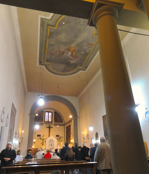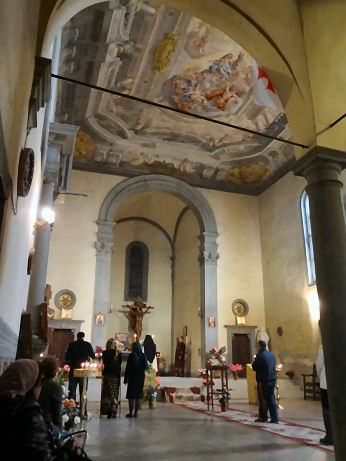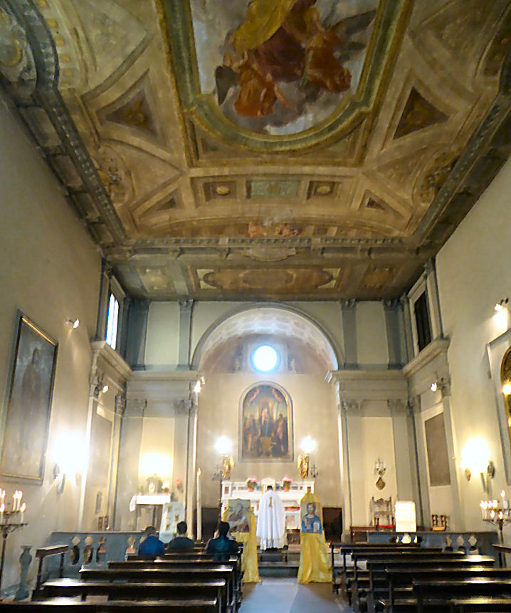 History ![]() The original church may date from the 10th century. A convent was added and having belonged to the Canons of Sant'Andrea a Mosciano, the Dominicans and the Silvestrines, in 1520 it was rebuilt at the behest of Lucrezia de 'Medici, daughter of Lorenzo the Magnificent, and granted to the Vallombrosan nuns, who dedicated it to the Holy Spirit. Restored in baroque style by Giovanni Battista Faggini in 1705-8. At this time the ceiling painting of The Glory of St George by Alessandro Gherardini was added, and the oval painting on Faggini's high altar, showing The Descent of the Holy Ghost by Anton Domenico Gabbiani. Other altarpieces were by Tommaso Redi, Jacopo Vignali and Passagnano. Suppressed by Napoleon in 1808, between 1926 and 1933 the complex was converted to house the headquarters of the Barracks Vittorio Veneto. The church is currently used by a Romanian Orthodox congregation, but due to structural damage to the roof they have to use the crypt (see photo far below right) through the small entrance doorway to the steep street (see photo right). But I recently read that in 2018, after a closure of 35 years, the roof was repaired and the church reopened. And in November 2021 restoration work on the baroque interior (see below right) and the installation of new lighting was completed. Lost art A very early Giotto - the Madonna of ![]() Alesso Baldovinetti's early Annunciation, panel, painted c.1457 for the Silvestrine friars here. In the Uffizi since 1868. Neri di Bicci Annunciation, with Saints Jerome and Francis, 1460. Painted at the commission of Bartolommeo Corsellini for this church, now in the Accademia. Two panels showing San Pietro Igneous and San Benedetto, the latter looking very troubled, described as Toscana Scuola are now in the in the Andrea del Sarto Cenacolo Museum at San Salvi. A panel depicting The Virgin and Child with Saints John the Baptist, Sylvester, Martin and Filippo Benizzi, by Agnolo di Donino is now on the high altar in Santa Lucia dei Magnoli down the hill. Opening times Opened for Romanian Orthodox services Sundays at 10.30. Update November 2021: I recently read that in 2018, after a closure of 35 years, the roof was repaired and the church reopened, and that restoration work on the baroque interior and the installation of new lighting was completed this month. News of any plans for opening/access was not forthcoming. It was certainly looking sprucer on the outside in February 2022 (see photo above right) |