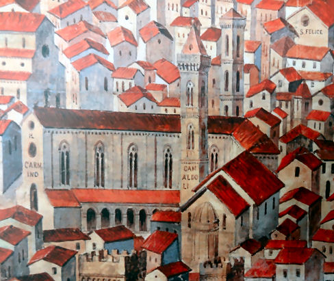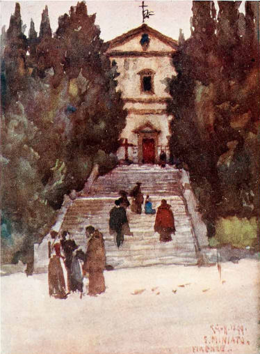 History A convent was founded here in 1417 by Observant Franciscans after a gift of land was made by Luca di Jacopo del Toso, with the stipulation that a church and convent be opened within a year. An oratory was built by 1419, dedicated to San Salvatore and San Francesco. This early church has been identified as the structure now known as the Cappellone, to the north of the present church. The Spanish siege of Florence in 1529 forced the Franciscans to vacate the complex and on their return in 1531 they found it much damaged. A new church was begun on 28th June 1431, which was finished, but for its roof, on 25th February 1435. This was a simple single-nave church on a north-south axis, visible on the Catena map, but proved structurally unsatisfactory, possibly due to unsound foundations, because in 1447 Cosimo de' Medici persuaded Castello Quaratesi to fund a new building, which he did in his will. (This after his offer to provide a façade for Santa Croce was refused.) He died in 1465, but designs provided in 1474 by a Fra Leone were declared to not be grand enough by Lorenzo de' Medici, which delayed the beginning of work. Building was begun around 1490, completed in 1504, under the supervision of Cronaca (Simone del Pollaiolo, the nephew of the painter brothers), who was also responsible for the design for the façade of Santa Croce, built much later. The façade here features the eagle symbol of the Arte di Calimala, who sponsored the work. Consecration followed in 1504. Following the Siege of 1529, during which the convent buildings were almost totally destroyed, the Franciscans moved to the Ognissanti complex in 1665, after which the church's name changed from San Francesco al Monte. But the Franciscans have since returned. This hilltop church ends an exhausting stairway mentioned by Dante and now set out as a Via Crucis for Holy Week processions. Michelangelo called the church the bella villanella (pretty country maid). The façade A design of considerable plainness, said to have been inspired by the austere teachings of Savonarola, but it was still thought too grand by the friars when it was being built. The façade features a single door with three windows above, with segmental and triangular pediments, only the middle one being real. The interior The interior is also plain, being said to be a balance between Franciscan austerity and the more grandiose needs of the patron. The walls are bare and off-white with sandy-coloured detailing and an open timber roof. It has triangular-pedimented clerestory windows echoing those on the facade and softening the gloom inside, a little. The minimally-decorated interior has, for example, no freeze decoration in the cornice between the upper and lower levels. The five interconnected deep side chapels on each side all have stained glass windows depicting saints, the designs for which are attributed to Perugino, and most have matching altars with plaster reliefs on the front against a yellow background. Art highlights ![]() Nothing in the chapels, but there's a rather nice Pietà with Saints over the last confessional on the left, with a very uncomfortable looking Christ (see right), said to be by Neri di Bicci. On the left wall of the apse is a Virgin Enthroned by Giovanni dal Ponte (see below right) with an odd Crucifix on the opposite wall. There are also two altarpiece panels depicting Saints Cosmas and Damian and Saints Francis and Anthony by Rossello di Jacopo Franchi, a pupil of Lorenzo Monaco. A terracotta relief of the Deposition by Giovanni della Robbia is over the north door. Tombs Buried here are Tanai de' Ner ![]() Lost relics On the high altar the Franciscans kept the habit said to have been the one worn by Saint Francis when he received the stigmata on Mount Verna in 1224. It came here following seizure as booty in1503 from the castle of Monte Acuto during the war against the Aratines. The Franciscans took the relic to Ognissanti with them but it was returned to the sanctuary at La Verna when the Franciscans left Ognissanti on November 1st 2000. Lost art The Annunciation, an altarpiece by Zanobi Strozzi from 1440-45 in the National Gallery, London came from here, having been installed in the 1435 church and later removed during the Napoleonic suppressions in 1810. It is thought to have been in the Lanfredini chapel here as their insignia (the red and white target) is visible on the capitals of the columns in the painting. Vasari reported on the painting being here, when the church was called San Francesco, but said it was by Fra Angelico, who was Strozzi's teacher. The painting is signed among the gilded foliage in the border of the Virgin’s cloak. A carved wooden Crucifix group by the German sculptor ![]() The church in art The Tate Gallery in London has two pages from one of Turner's sketchbooks which it labels Two Sketches of a Church in Florence (San Salvatore al Monte?) and that question mark is well earned. There's also a clearer view called Florence from San Miniato al Monte, with San Salvatore al Monte. He drew many panoramas of Florence from up here too. A lovely pen and wash drawing by Giuseppe Zocchi, from the early 1740s, of a panorama of Florence and a side view of San Salvatore is in the Albertina in Vienna. One of 19th century painter Robert Charles Goff's many scenes of Florence and Tuscany features San Salvatore al Monte (see right). He was a follower of Whistler and an Irish Army colonel who travelled much and lived in Florence and Brighton |
