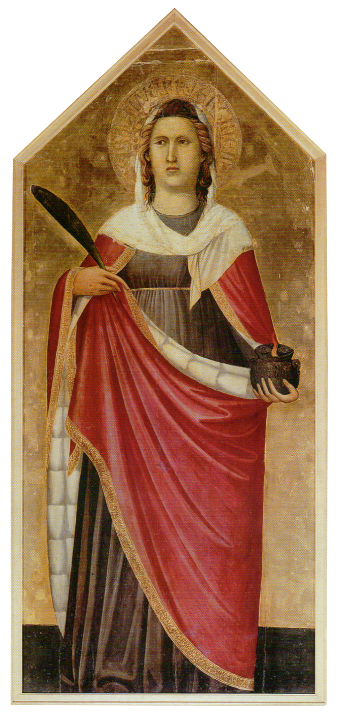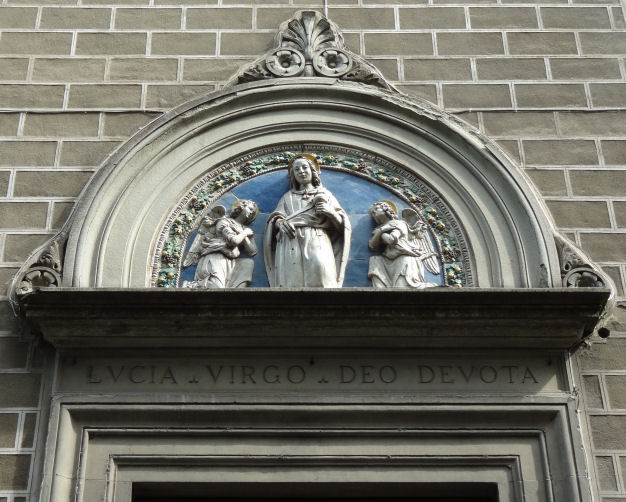 History The church was founded next to a pilgrims' ospedale in 1078 by Ugoccione della Pressa, a local miller, and finished by his elder son Màgnolo following the death of Uguccione, and so was later known as 'dei Màgnoli'. Tradition has it that this hospital was where Saint Francis and Saint Dominic met in 1211. Francis is said to have visited the nurses here in that year, commemorated by a tabernacle in via de' Bardi. The hospital was destroyed by the landslide of 1284, from which the church also suffered severe damage, and so was also subsequently known as Santa Lucia delle Rovinate (of the Ruins) this suffix also being applied to other buildings in the area. Around 1246 the church passed to the Cluniac monks of San Miniato al Monte, possibly due to the Magnoli family’s devotion to San Miniato. The Cluniac monks continued here until they were replaced at San Miniato in 1373 by Pope Gregory XI with Olivetan Benedictine monks. In 1421 patronage passed to the Uzzano family, who paid for the decoration of the main chapel, including Domenico Veneziano's high altarpiece (see Lost art below). As part of the dowry of Ginevra Da Uzzano patronage passed to the Capponi family, along with their adjacent palazzo. ![]() Reconsecrated on May 3rd 1584. The church was rebuilt again in 1732, with an aisle-less nave. Further restorations since then. The lunette over the door is St Lucy Flanked by Two Angels by Benedetto Buglioni, who headed up a rival studio to the della Robbia and probably trained with them. The church is currently used by a Polish congregation. Interior Aisleless with a bare-walled nave with three pietra serena altars each side and a flat frescoed ceiling. The apse is cross-vaulted and more baroquely decorated. The first altar on the left has a much-restored panel painting of Saint Lucy by Pietro Lorenzetti from around 1320 (see right). The sword in the saint's neck, removed during restoration, can still be seen in outline. It was attributed to Giuliano Pesello, a pupil of Andrea del Castagno, until 1905, and its then attribution to Lorenzetti is still not universally accepted. Over the next altar is a Virgin in Glory with Saints by Empoli. The panel depicting The Virgin and Child with Saints John the Baptist, Sylvester, Martin and Filippo Benizzi, on the high altar is by Agnolo di Donino (although the church caption says Florentine School) and was originally in San Giorgio alla Costa up the hill. It replaced the altarpiece by Domenico Veneziano mentioned below. There is a chapel to the right of the entrance, built in 1714-15 in imitation of the Holy House of Loreto (an example of which also exists in the church of San Pantalon in Venice) which contains a wooden Virgin from Loreto. It also houses The Angel of the Annunciation and The Virgin Annunciate by Jacopo del Sellaio (1473).
