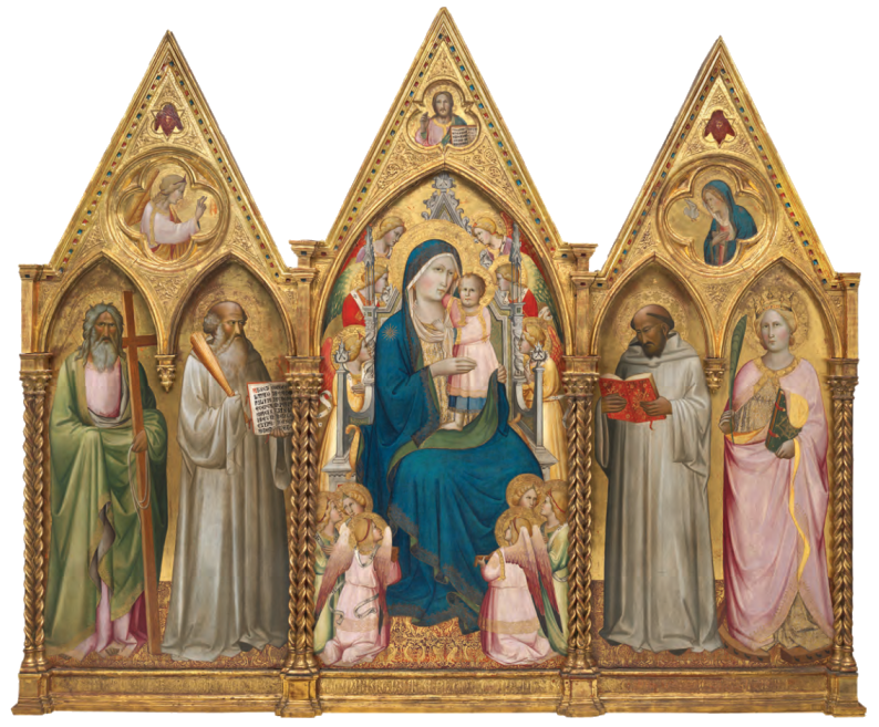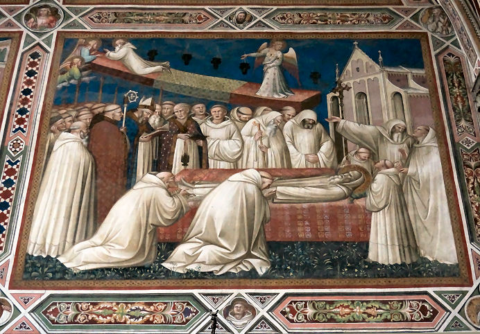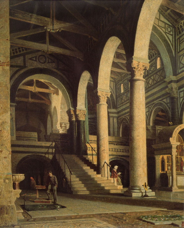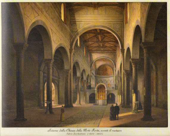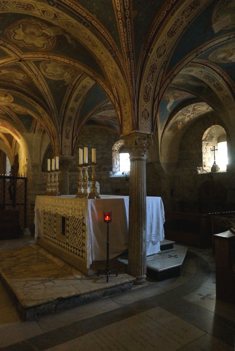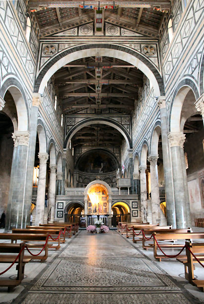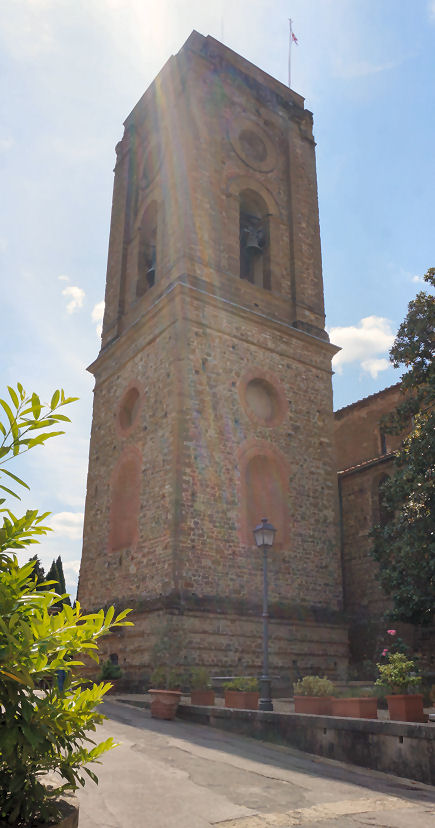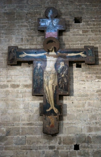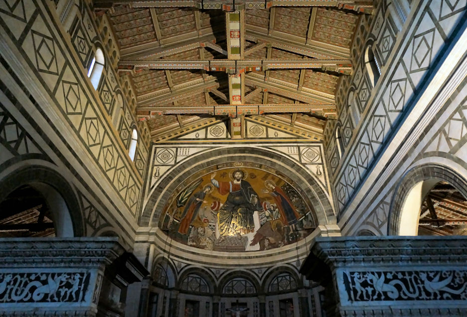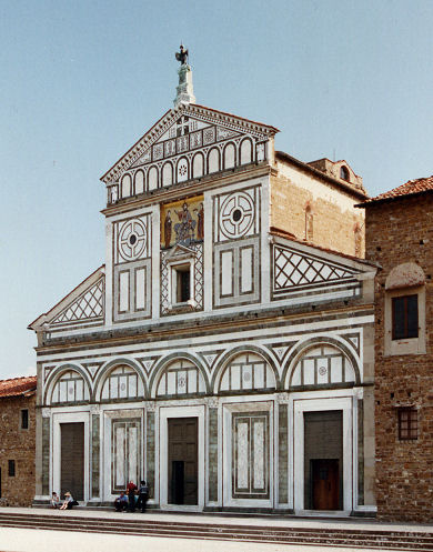 ![]() Florence's oldest surviving church after the Baptistery, and like it Tuscan Romanesque in style, San Miniato was built from 1028 to 1063 by Hildebrand, Bishop of Florence, on the site of a chapel protecting the tomb of Saint Minias which had been here since at least the 8th century. Minias is said to have been an Armenian prince serving in the Roman army who refused to sacrifice to the Roman gods. He was martyred by decapitation down in the Piazza della Signoria in 250 and he is said to have carried his decapitated head up to this site following his execution. His relics are kept in the crypt here. The Cluniac Benedictine monastery was given to the Olivetan Bendictines by Gregory XI in 1373. The complex was used as a barracks and fortress by Grand Duke Cosimo I, due to its commanding position, then in 1630 as a plague hospital, and later as a poorhouse. In 1703 Cosimo III gave the monastery to the Jesuits, who remained here officially until Clement XIV suppressed them in 1774. But they remained secretly, protected by Florentine aristocratic supporters. The Olivetans returned in 1784, until the Napoleonic suppressions of 1808. In 1924 they came back yet again and remain here, also looking after the church. The church The sectional façade was begun around 1090, made with white and green marble in geometric patterns, arguably inspired by Arabic decoration. The flattened-arcading effect at ground level is suggestive of a narthex, maybe. The 13th century mosaic panel depicts Christ Between the Virgin and San Miniato and was remade in 1861. High up over the blind arches in the tympanum are square panels which repeat designs from the floor inside. The eagle with outstretched wings clutching a bale of cloth on the very top is the symbol of the cloth importers guild (the Arte di Calamila) who had been responsible for the church's upkeep since 1288. Interior San Miniato is special, in the same way that the Miracoli church in Venice is special, only it's that much bigger, and has frescos. The nave is separated from the aisles by marble columns with various capitals - each side consisting of three pairs separated by a pair of compound piers with half shafts supporting the stout diaphragm arches over the nave. The columns towards the east end are visibly too big for their capitals, these being spolia, recycled from much earlier Roman temples in Florence. Towards the west they do fit, so are probably contemporary. The floor and upper part of the nave is all clad in marble, with a timber ceiling of 1322 that's colourfully decorated. The floor is from 1207 and of opus sectile, looking like a made-of-marble carpet. The clerestory-level decoration, which is painted in imitation of marble, dates from the 19th century, when the roof and polychromatic ceiling was restored. There is a raised choir over a crypt, with a tabernacle in front of it. The tabernacle, the Capella del Crocefisso, was built to house the miraculous Crucifix which was said to have bowed to San Giovanni Gualberto - this Crucifix has been in Santa Trìnita since 1671, and its story is told on that church's page. The tabernacle here was built for Piero il Gottoso Medici (Piero the Gouty) in 1448, around the same time as he was having the larger and more ornate tabernacle built to house the similarly miraculous image at SS Annunziata. Pagno di Lapo Portigiani and Michelozzo were involved in both projects, with Luca della Robbia working on ceiling panels of this one. The controlling Calimala guild (the guild of cloth finishers and merchants) were initially resistant to allowing Piero to add his family and personal arms to the decoration of the tabernacle. But they gave in. Michelozzo's gilded bronze eagle of the Calimala guild, clutching a bale of cloth, dominates the front face, but you'll also find Piero's falcon, his symbol of a diamond ring encircling three feathers and the Medici family palle. The painted panels at the back, which protect the Crucifix, are the work of Agnolo Gaddi (1394-96) and show scenes from the lives of Saints Miniato and Giovanni Gualberto, the Annunciation, and the Passion of Christ. They were originally arranged in a cruciform shape to protect the crucifix. ![]() The left-hand aisle wall begins with two detached frescoes by Mariotto di Nardo (a Virgin and Child with Saints and a Crucifixion with Seven Saints) and a damaged but admirable anonymous Crucifix (see right). Here is also the projecting (as you can see on the plan at the top of the page) Chapel of the Cardinal of Portugal Built 1460-68 to plans by Antonio Manetti, a pupil and biographer of Brunelleschi, but with the work done by Bernardo Rossellino, the older brother of Antonio, the sculptor of the tomb here. Cardinal Jaime of Lusitania, the nephew of King Alfonso V of Portugal, died of fever on route from Rome to Austria on the 27th August 1459 at the age of 25. Amongst his last words, according to the Florentine bookseller Vespasiano da Bisticci, was a request he be buried in San Miniato. His aunt, the Duchess Isabella of Burgundy, the wife of Philip the Good, and his humanist friends funded the chapel, the only one in the church apart from the saint's. It was created by knocking a hole in the wall and building the chapel, square like a classical mausoleum. The tomb itself, to the right, is by Antonio Rossellino and is his masterpiece. To the left of the tomb. opposite the chapel's entrance is the altar with an altarpiece showing three standing saints - Saint James, the cardinal's name saint, who gazes out at the cardinal's tomb, flanked by Saints Vincent (the patron saint of Portugal) and Eustace. The paintings in here are all hard to see though, due to dinginess, and this altarpiece is a copy, the original, painted before 1466 by Antonio and Piero del Pollaiuolo, being now in the Uffizi, having been moved there in March 1799 because of concerns for its deteriorating condition. Its Netherlandish plushness, particularly in the fabrics, is said to