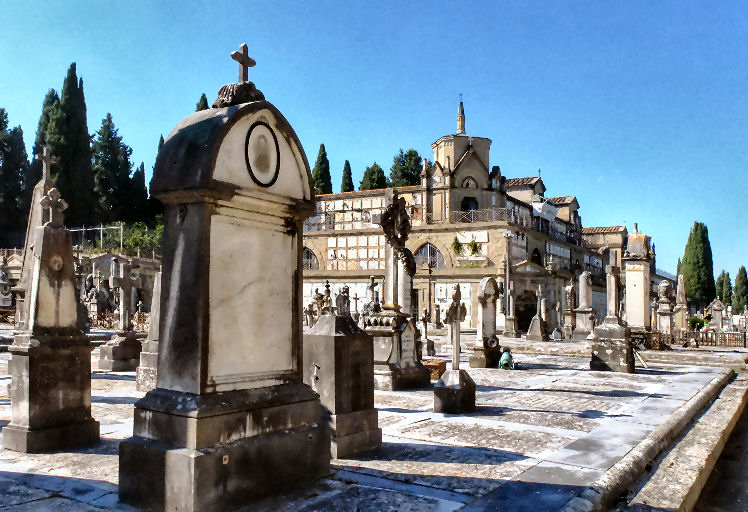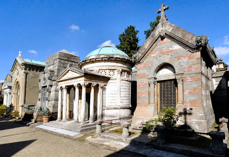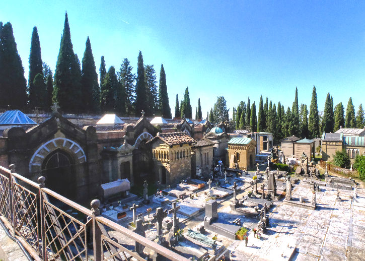 The Porte Sante Cemetery was planned from 1837 but work began seriously only after the cholera epidemic of 1854. Santa Croce had become overcrowded and it being the period when Florence was Italy's capital added to the urgency. The original architect was Niccolò Matas, who was also responsible for the façade of Santa Croce. Later, in 1864, Mariano Falcini replaced Matas and his plans involved expansion of the cemetery into the area beyond the 16th-century fortress adjoining the church, the walls of which had been designed by Michelangelo and incorporated in Matas's plan. These plans were not implemented. The monumental entrance was built, in the 1920s, but the planned Pantheon never was, so the graves of the famous are dotted around. Amongst the cemetery's more famous burials are Carlo Collodi, creator of Pinocchio, Franco Zeffirelli, the Florentine film director, and the author Vasco Pratolini. The site initially seems quite small, with not much monumental sculpture and few mausoleums. But once you pass the campanile around the left side of the church the change in scale is massive.